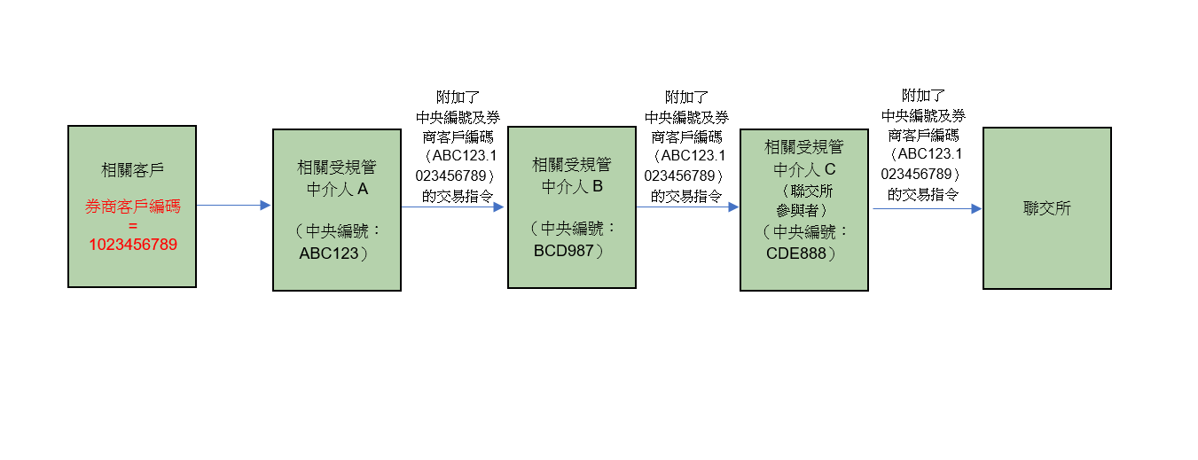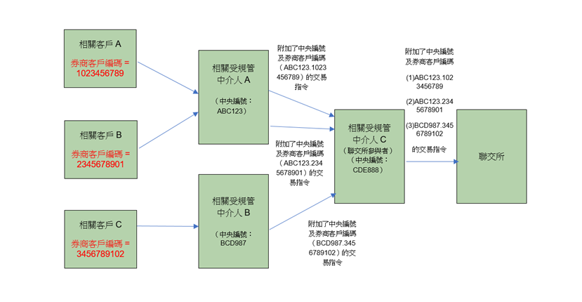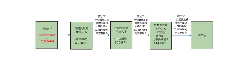 不是。一項交易指令只能附加一個券商客戶編碼,而該券商客戶編碼須經由券商中介鏈被傳送至聯交所。中介鏈中最後一名相關受規管中介人(由交易所參與者開始向後計算),須負責編配券商客戶編碼、收集客戶識別信息,編製配對檔案,以及將配對檔案提交予聯交所。該中介鏈上的其他相關受規管中介人,應確保它們所接獲和傳遞的交易指令已附加了券商客戶編碼(由最後一名相關受規管中介人所編配)。請見下圖的例子。