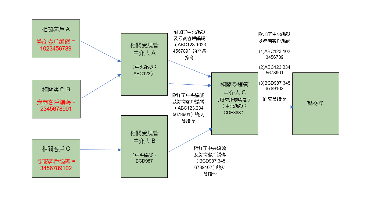 在某些情況下(如下圖藍色箭嘴的交易指令所示),相關受規管中介人B可能收到來自非相關受規管中介人(如海外券商)的交易指令,而該交易指令已附加券商客戶編碼。這時相關受規管中介人B的責任是,確保其收到及傳遞的交易指令已附加券商客戶編碼(該券商客戶編碼由中介鏈的最後一名相關受規管中介人——即相關受規管中介人A——所編配)。相關受規管中介人A(如下圖所示)應確保交易指令資料包含其中央編號及編配予客戶C的券商客戶編碼。此外,根據《操守準則》新增的第5.6(g)段,相關受規管中介人A應採取合理步驟,確保交易指令獲編配及附加的券商客戶編碼會由接收交易指令一方(就本例子而言,即海外券商)傳送至中介鏈中的下一名相關受規管中介人(即相關受規管中介人B)。相關受規管中介人B不會被要求審查其直接客戶的客戶(在此情況下,即海外券商的客戶)是否為相關受規管中介人。