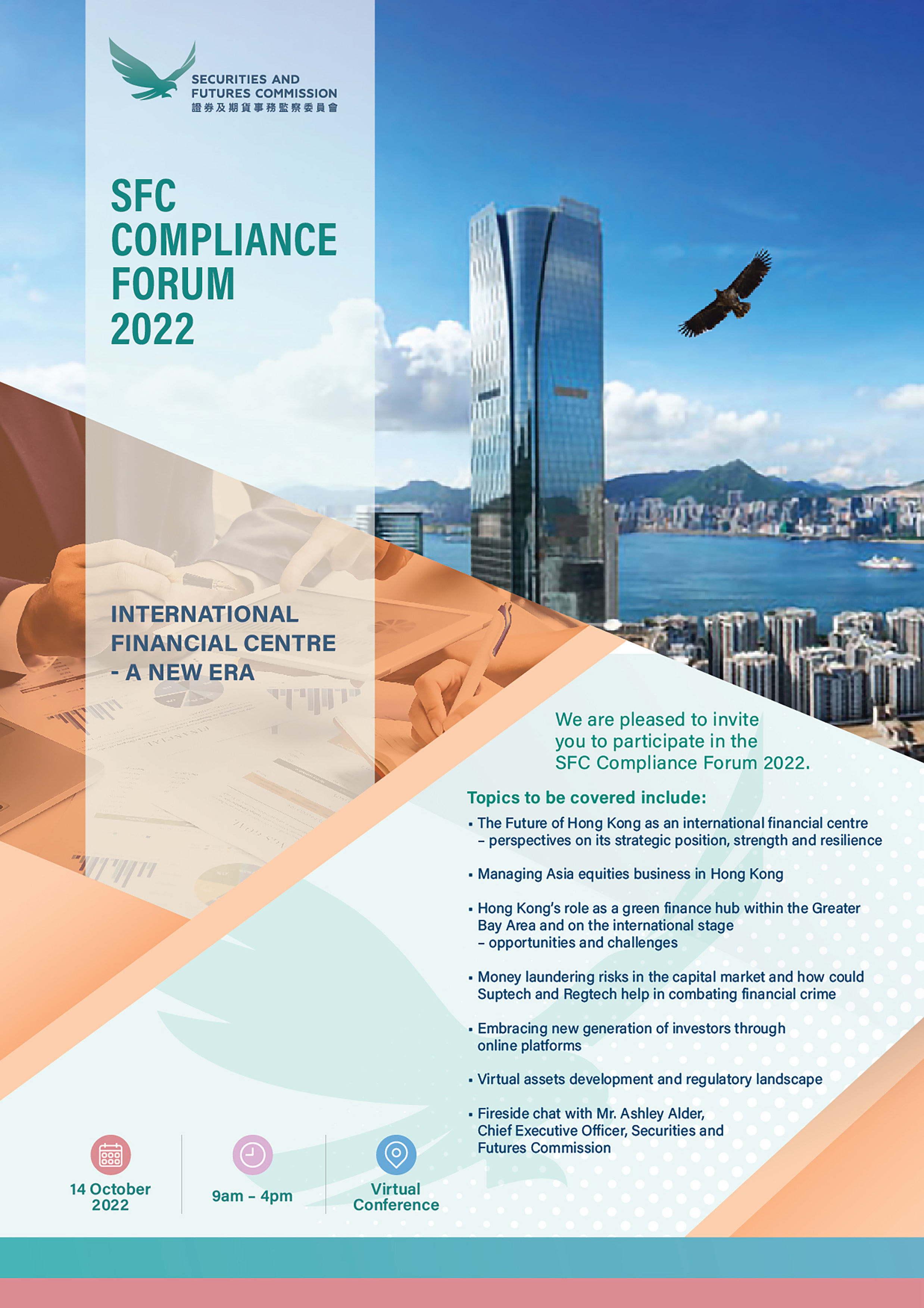 Themed “International Financial Centre – A New Era”, the SFC Compliance Forum 2022 forum was held virtually on 14 October. Over 2,500 market participants registered to participate in the Forum. SFC’s Chief Executive Officer Mr Ashley Alder spoke about the development of Hong Kong as an international financial centre and shared his views on maintaining market integrity during challenging times. Other industry leaders discussed a range of topics including the future of Hong Kong as an international financial centre, the opportunities and challenges for Hong Kong as an Asian equities hub, the role of Hong Kong as a sustainable finance centre, money laundering risks, operational challenges and risks issues of online platforms and the regulatory landscape of virtual assets.