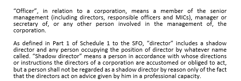 These three categories are not mutually exclusive. For instance, an individual can simultaneously be a director, responsible officer and MIC of a licensed corporation.