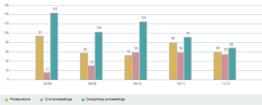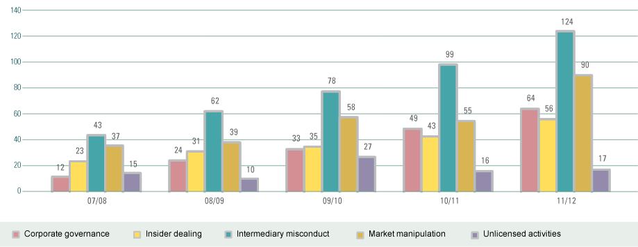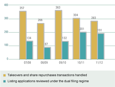 These charts and tables are intended to show at a glance some top-line measurable aspects of our activities, which, in turn, are a reflection of the market. Except noted otherwise, the figures are cumulative for each reporting year and compared over a five-year period. For a breakdown of some of these top-line items, please see tables in Breakdown of SFC Activity Data.
