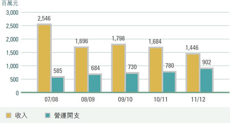 本年度盈餘為5.44億元,少於去年的9.03億元。於2012年3月31日,本會的累積儲備為75億元,我們一直嚴格按照財政司司長核准的投資指引管理這筆儲備。