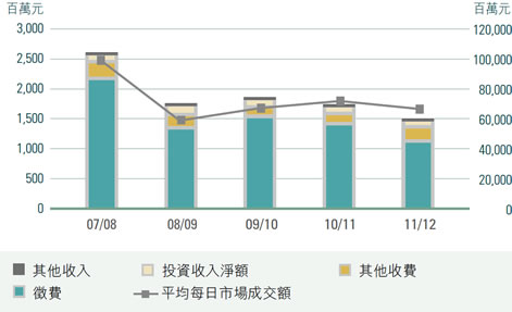 本年度總收入為14.5億元,較上年度的16.8億元下跌13.7%。由於證券市場的成交額下跌及徵費率下調,本會的徵費收入為10.9億元,較上年度的13.7億元減少20.4%。
