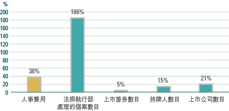 我們成功將持續監管活動的支出控制在9.016億元,較原來預算的10.552億元減少1.536億元。員工是我們最寶貴的資產,年內人事費用佔總支出超過70%。過去五年,本會的人事費用只增加38%,而法規執行部處理的個案數目則飆升186%、上市證券數目上升5%、持牌人數目增長15%及上市公司數目增加21%。